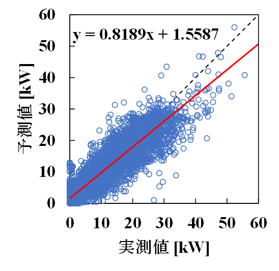 実測したビルマルの消費電力の年間予測精度を検証する.消費電力の予測精度は85%以上まで確保できている.休日も稼働し,活動時間も朝から深夜に及ぶため正確な予測は難しいが,データセットを加工してさらなる精度向上を目指す.