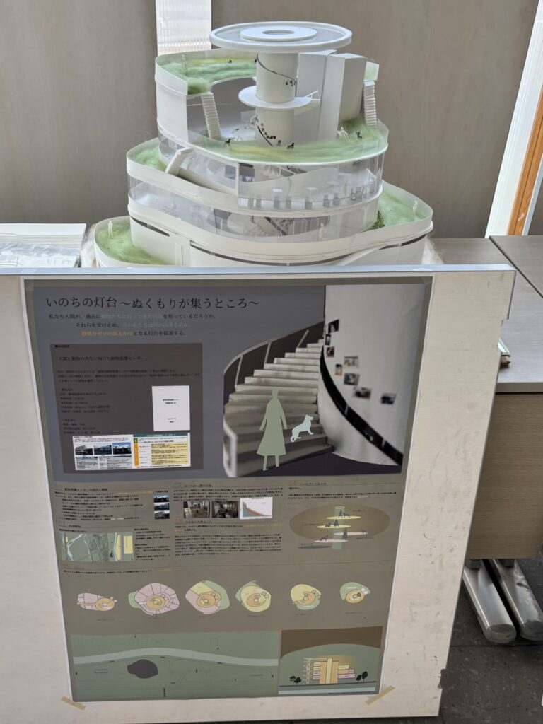 この課題での提案は、過去に静岡県でも行われていた殺処分という人間が動物たちに行っていた行為を受け止め、今そして未来に向け殺処分ゼロの訴えかけとなるような建築の提案で、「いのちの灯台」という作品です。