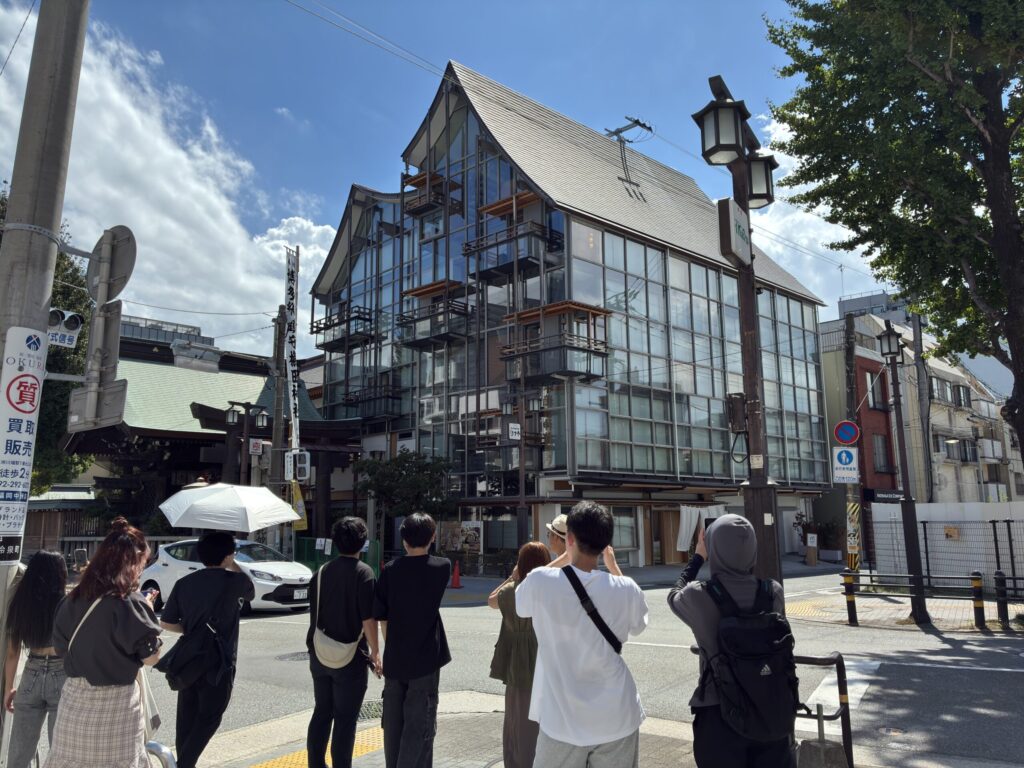 写真のように田井幹夫研究室では、田井教授のレクチャーを聞きながら建築ツアーを行なっています。レクチャーでは自分には無い、新たな視点で建築を見ることができます。