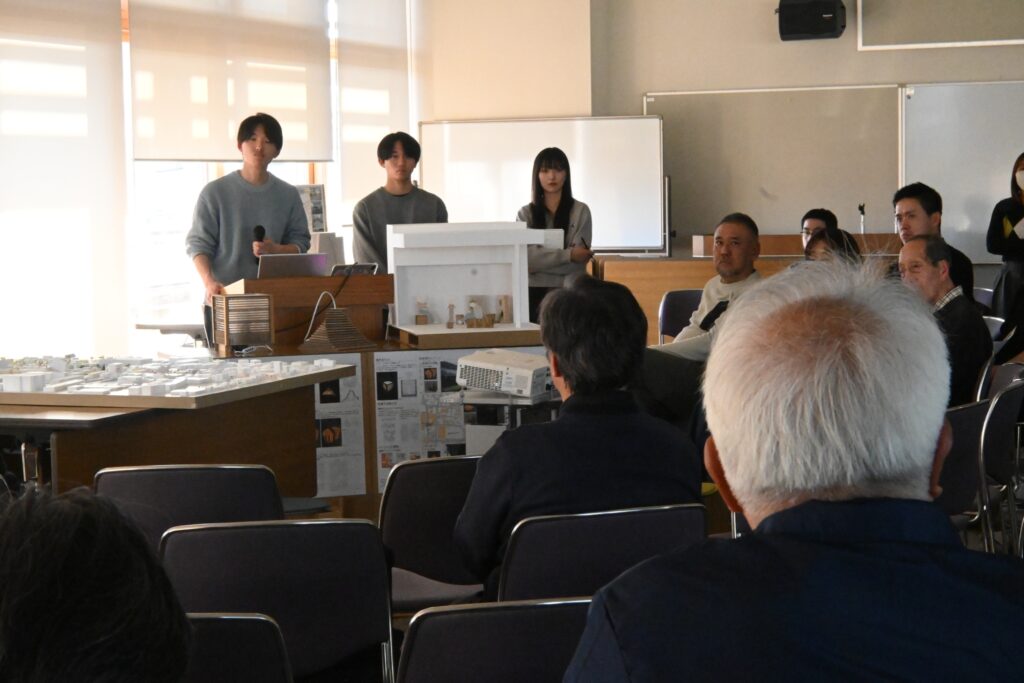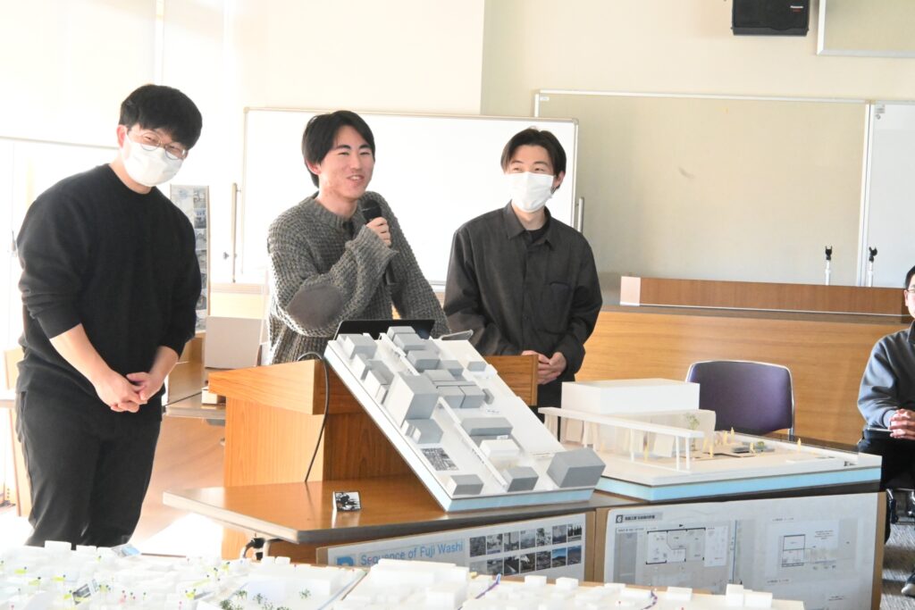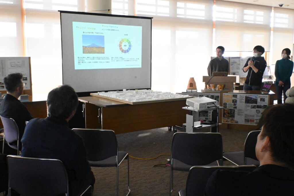 「Orange Trapezium」「Looping YATAI」「Sequence of Fuji Washi」「Normalize industry」という4チームに分かれデザインしてきた提案を発表しました。